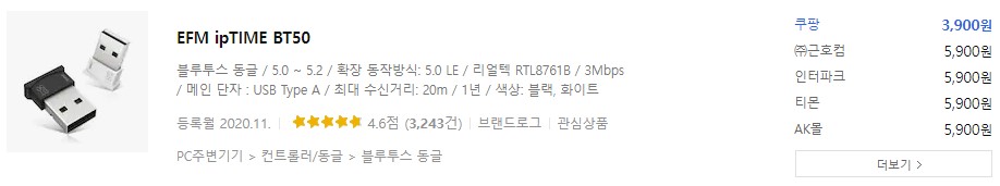 다나와에서 동글이를 검색해서 사려고 했다.(원래는 Dongle이니 '동글'이라고 부르는게 맞는 것 같은데 '동글이'가 더 귀여우니 이렇게 부르자) 뭐던 안 그러겠냐만은 블루투스에 대한 지식이 따로 깊진 않았으므로 적당히 최신 버전과 송수신 속도, 거리, 에어팟프로 연결에 성공한 리뷰가 있는지 정도로 알아보았는데 다행히 원하던 스펙의 제품들이 많이 있었다.
