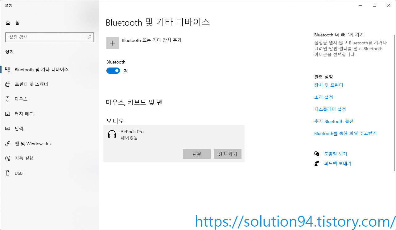 이상하게 '연결 중' 메시지가 굉장히 오랫동안 떠있었다. 이렇게까지 오래 걸릴 리가 없거늘... 한참 후에 '연결됨'으로 바뀌었는데 귀에 꽂혀 있는 에어팟에는 연결됐을 때 나는 알림음도 나지 않았고 PC에 '연결됨'으로 나와 있던 메시지가 '페어링됨'으로 다시 바뀌어있었다. 혹시나 싶어 에어팟 전원도 껐다 켜보고 PC도 껐다 켜보았으나 똑같았다.