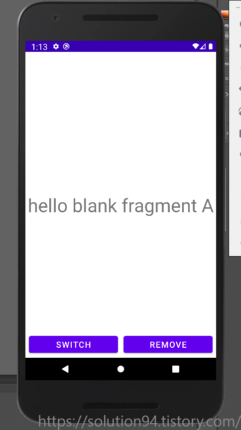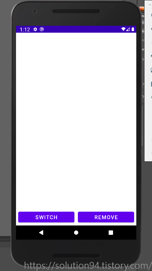 MainActivity에 FragmentContainerView를 위치시키고, 'SWITCH' 버튼을 클릭하면 각 프래그먼트 A와 B를 Replace 시키고 'REMOVE' 버튼을 클릭하면 remove 시키는 테스트 프로젝트 작성했다.