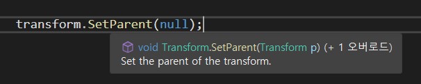 먼저 'Transform' 컴포넌트는 'Inspector' 창에서 보이는 것처럼 Position(위치), Rotation(회전), Scale(크기)를 제어하는 기능을 갖고 있다. 또한 'Inspector' 창에서는 보이지 않지만 오브젝트 간의 '부모-자식' 관계의 상태를 저장하고 있기도 하다. 그래서 실제로 'MonoBehaviour'에서 보면 오브젝트의 '부모-자식' 관계를 제어하는 기능은 'Transform' 클래스 안에 존재한다.