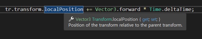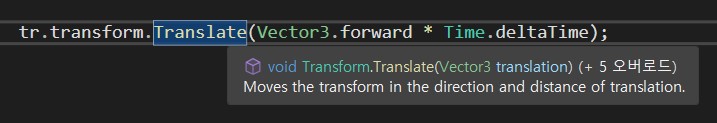 이 또한 친절하게 적혀있지만 실제로 실행시켜보면 조금 혼란스러울 수 있다. 간단하게 설명하자면, 자신의 부모 오브젝트 기준의 XYZ를 따른다. 만약 움직이려는 'tr'의 부모 오브젝트가 존재하고, 그 부모 오브젝트가 45도 만큼 오른쪽으로 회전되어 있다면 부모 오브젝트의 정면은 45도 만큼 오른쪽으로 회전되어있는 방향을 가리키게 되므로 그 방향을 향해 움직인다. 설명에 적혀있는 '상대적'이 이것을 뜻한다.
