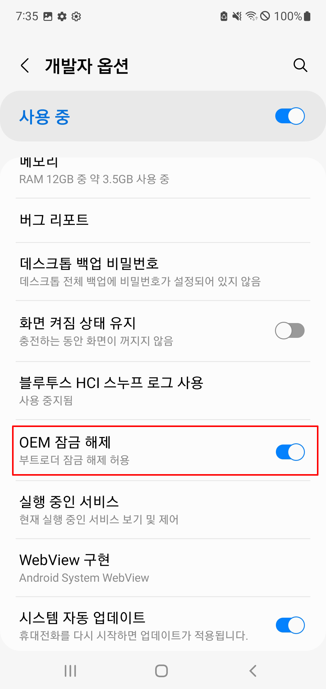 이제 마지막이다. '설정 - 휴대전화 정보 - 소프트웨어 정보'에서 '빌드번호'부분을 연타해서 개발자 모드를 활성화시켜주고 '개발자 옵션'으로 들어가 'OEM 잠금 해제'를 활성화시켜준다.