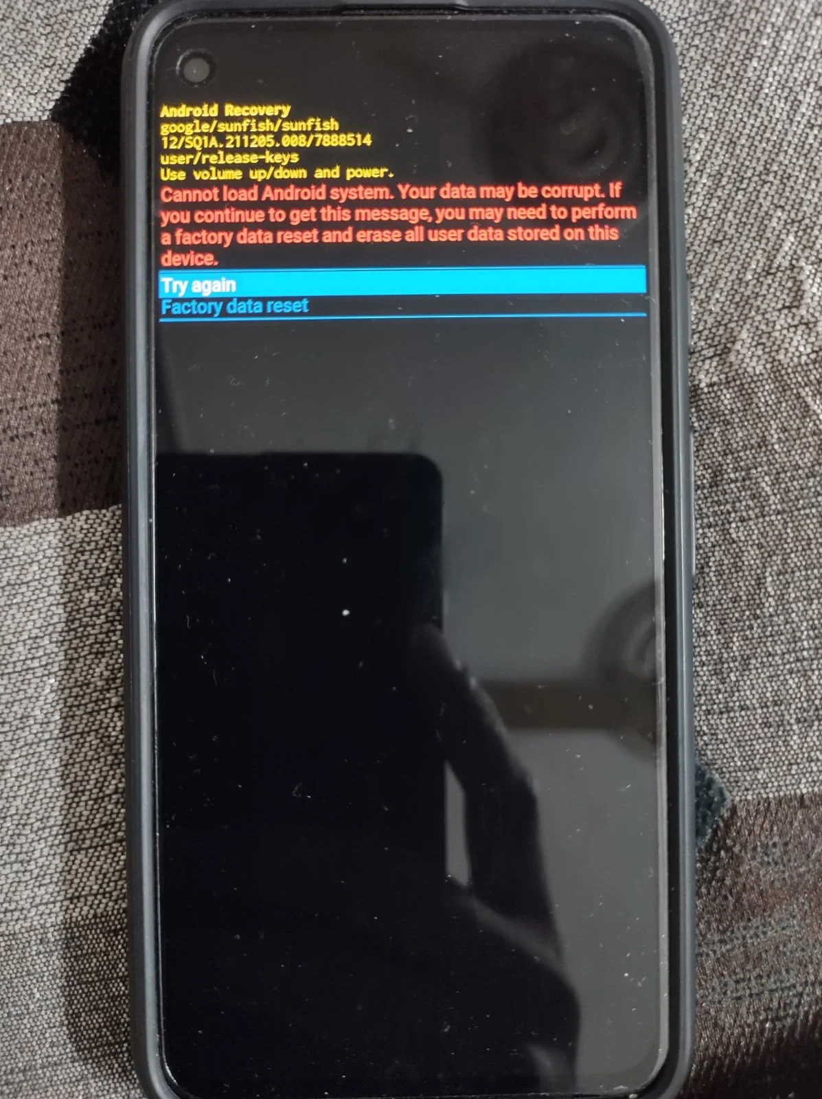 => 다른 경우는 모르겠고 나의 경우 공장 초기화를 통해 정상화시킬 수 있었다. 'Factory data reset'으로 볼륨 키를 사용해 이동 후 전원 키를 사용해 선택해 주면 된다.
