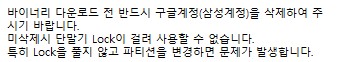 그러면 왜 계정을 제거시켜놔야 하느냐? 아직 오딘을 실행시키기 전이지만 후에 오딘 실행시 경고 문구가 출력되는데 여기서 보면 계정을 삭제해 달라고 한다. 그렇지 않으면 Lock이 걸려서 기기 사용이 불가능해진다고 한다.