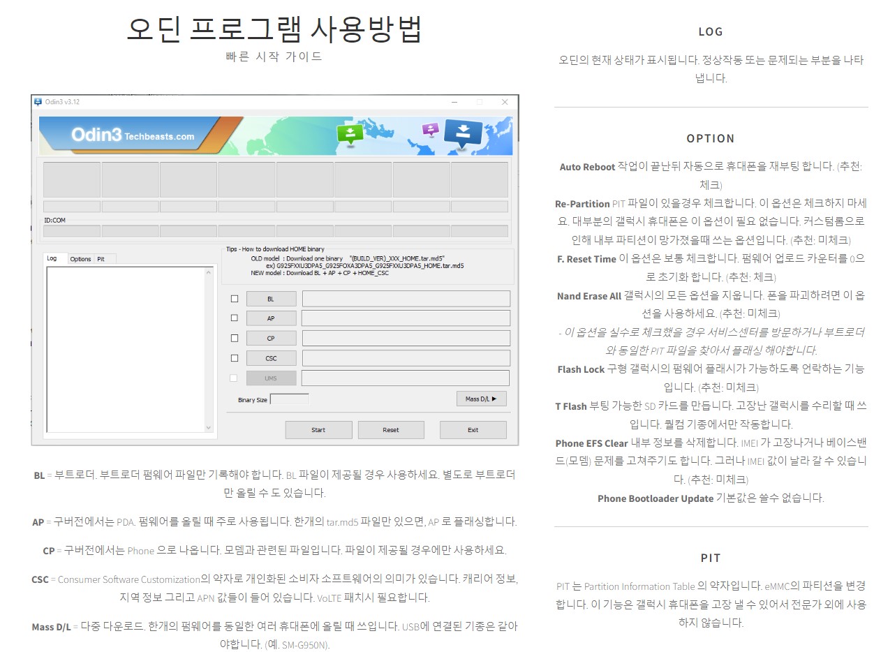 링크에서 '오딘'이라는 프로그램을 다운로드한다. 설치 프로그램은 아니다. 방금 위에서 다운 받았던 펌웨어 압축파일의 내용물이 대체 뭘까 궁금한 사람들은 하단에 친절하게 적혀있으니 읽어보면 좋겠다.