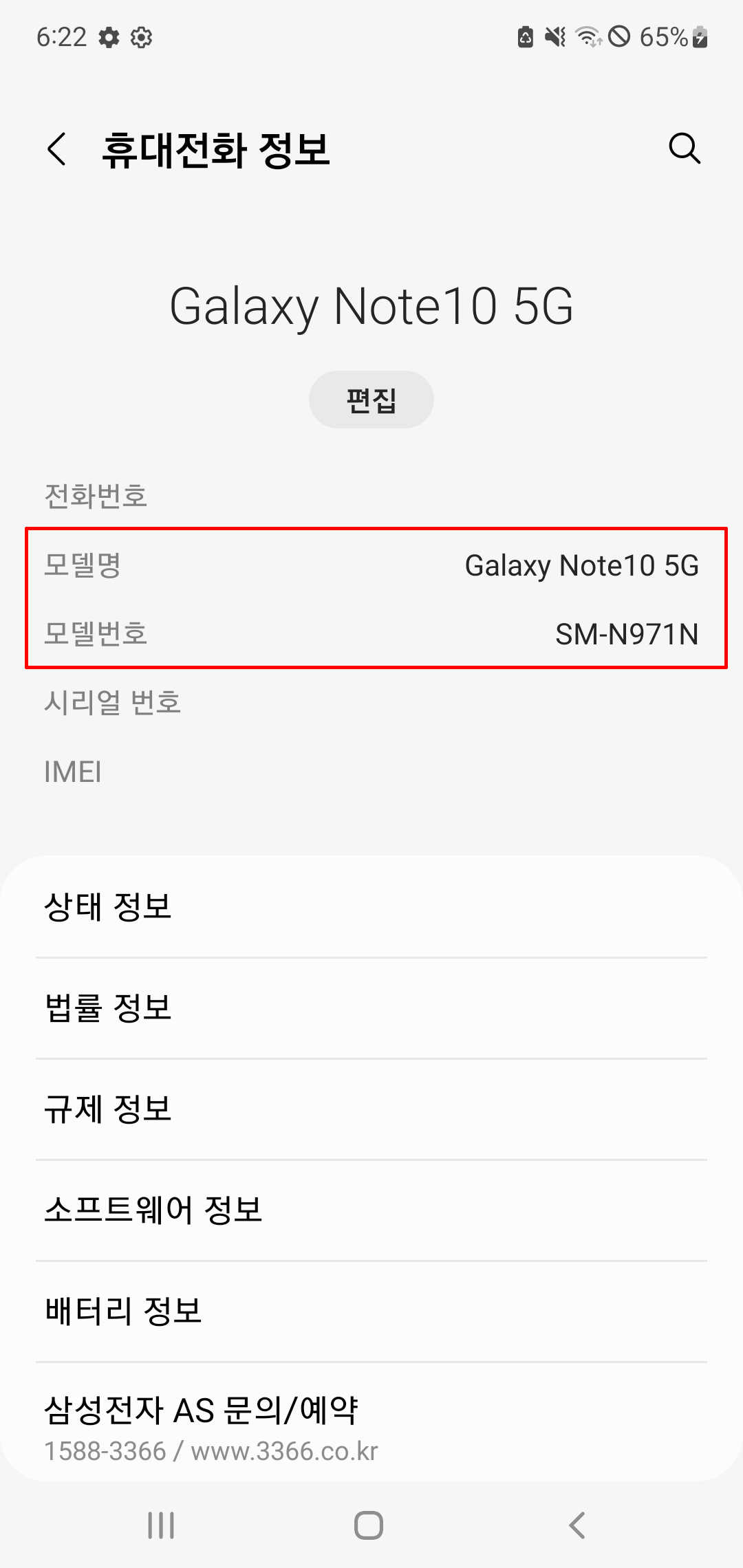 2. '옵션 - 휴대전화 정보'에서 모델번호 확인 : SM-N971N