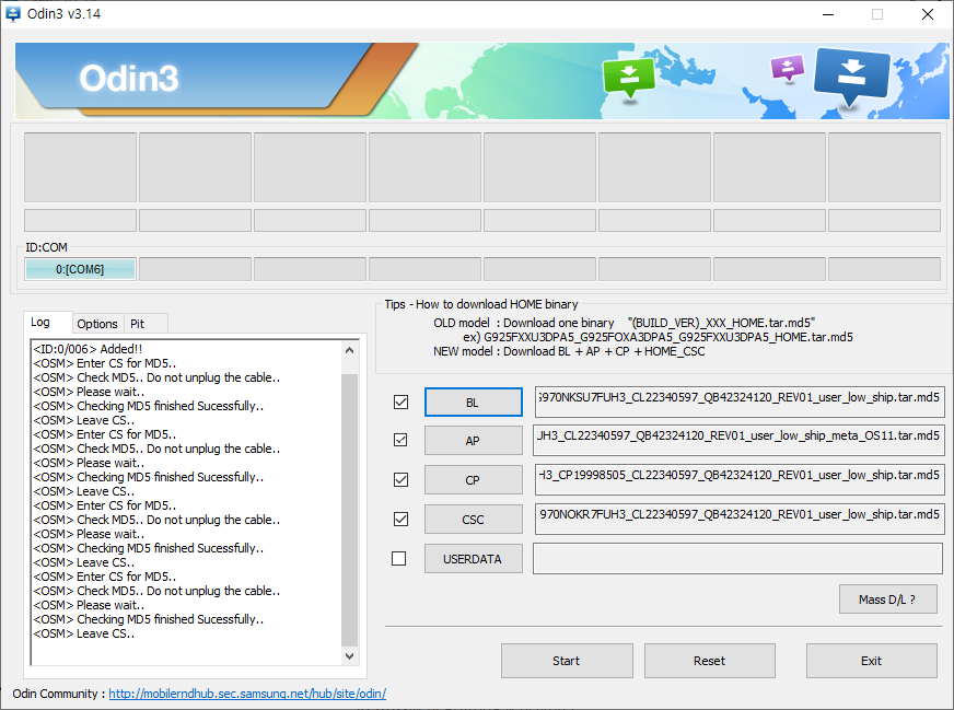 이제 다운로드 받았던 펌웨어를 넣어주면 된다. 펌웨어 파일들을 보면 파일명 각각 앞에 BL, AP, CP, CSC_OMC로 시작하는데 버튼을 클릭해서 해당되는 파일들을 넣어주자. 'USERDATA'는 필요 없고 'CSC'의 경우 'HOME_CSC_OMC'가 아니고 'CSC_OMC'이니 헷갈리지 말 것. 'AP' 파일을 넣어줄 때 몇 초 정도 시간이 소요되는 게 정상이니 멈춘 줄 알고 끄지 말자.