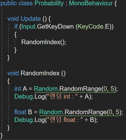 그리고 사실 이게 가장 중요해서 말씀드리려고 했던 건데 두번째로 int와 float 랜덤 모두 RandomRange(min, max) 입니다. 즉 최솟값과 최댓값의 범위를 지정해주는 건데 int형의 랜덤 범위는 최솟값 이상, 최댓값 미만 입니다. 하지만 float형의 랜덤 범위는 최솟값 이상, 최댓값 이하입니다.