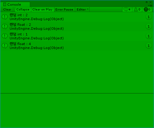 스크립트를 저장하고 플레이 상태에서 E키를 2번 눌러봤습니다. int와 float의 값이 랜덤하게 프린트되는 걸 확인하실 수 있습니다.