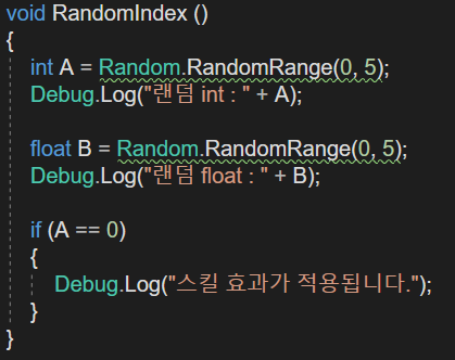 만약 int A가 0이 나온다면 스킬 효과가 적용되는 조건문을 넣으면 0~5의 (0, 1, 2, 3, 4) 총 5개의 인수 중 랜덤한 1개가 나오게 되니 20%의 확률로 나오게 되겠죠? 이런 방식으로 응용하면 됩니다. 그 밖에 다른 조건문들로도 동일하게 사용할 수 있으니 용도에 맞게 사용하시면 되겠습니다 :D