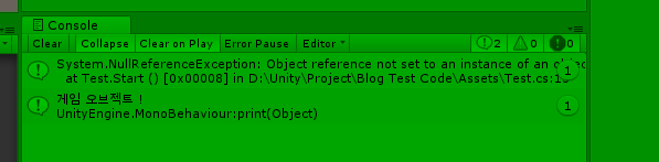 작성한 스크립트를 아무 오브젝트에 추가시켜주고 실행시켜보면 NullReferenceException 이라는 오류가 콘솔창에 디버그 되는 모습을 볼 수 있습니다. 이는 참조값이 없다는 말인데요.