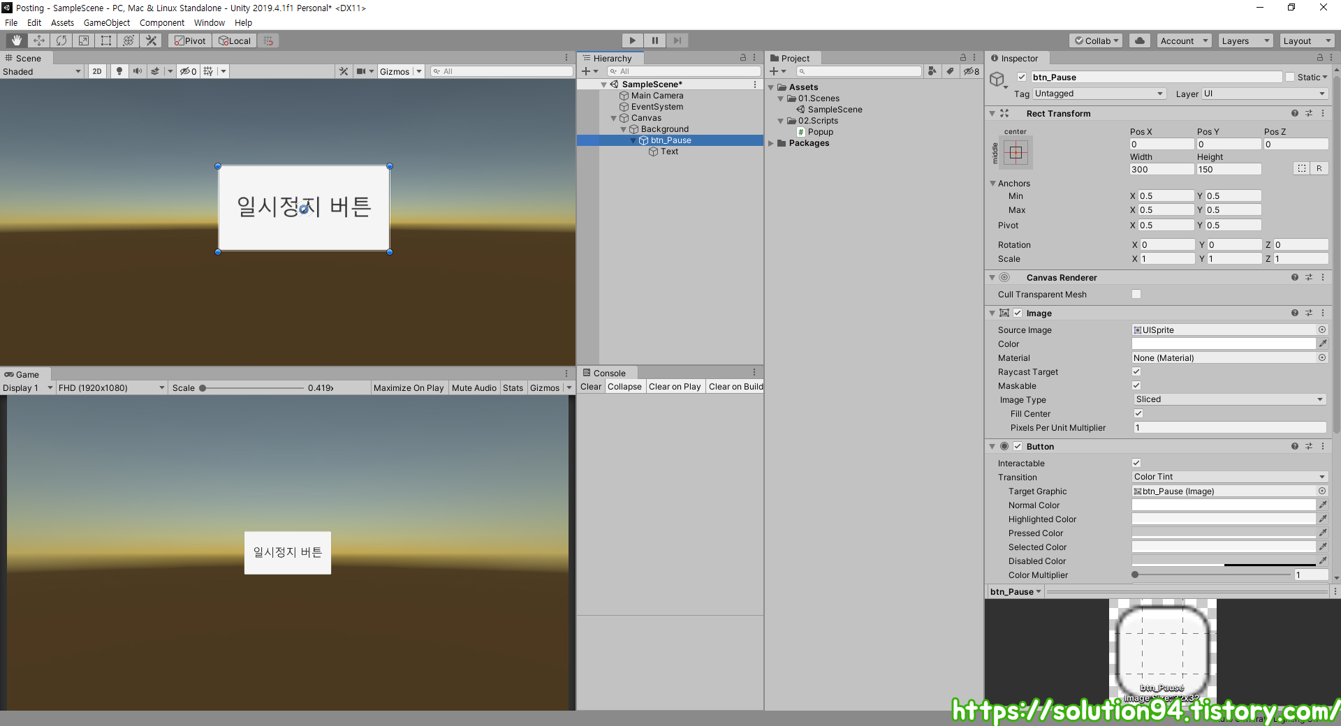 팝업 창을 띄워주기 위한 이벤트로 일시정지 버튼을 생성시켜주도록 할게요.