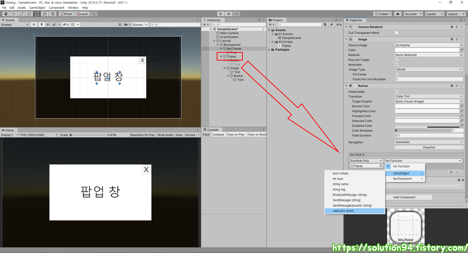 버튼의 클릭 이벤트가 발생될 경우 해당 오브젝트의 SetActive값을 true시킴