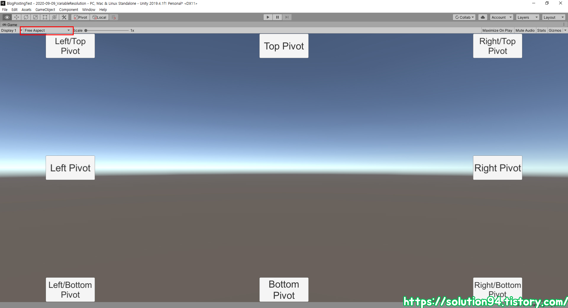 하지만 비율과 상관없이 화면에 가득 채워지도록 Free Aspect 옵션으로 변경해주면, 이전과는 다르게 각 모서리에 자동으로 배치되는 모습을 보실 수 있습니다. 이는 가운데 피벗이 아니라 각 버튼 오브젝트들의 피벗 값이 캔버스의 모서리 끝으로 설정되어 배치되기 때문입니다.