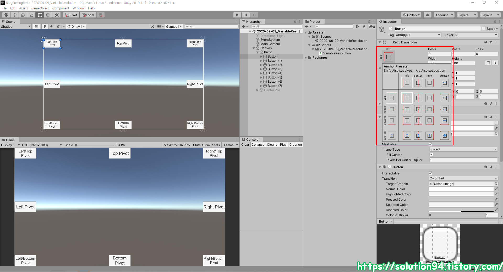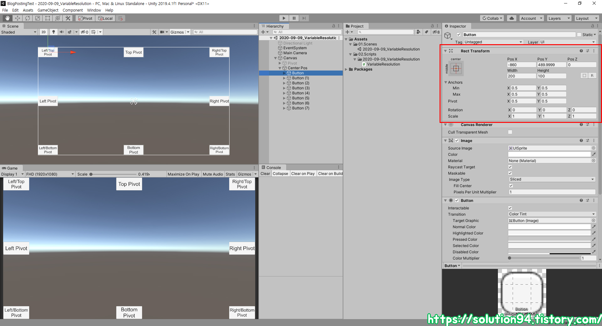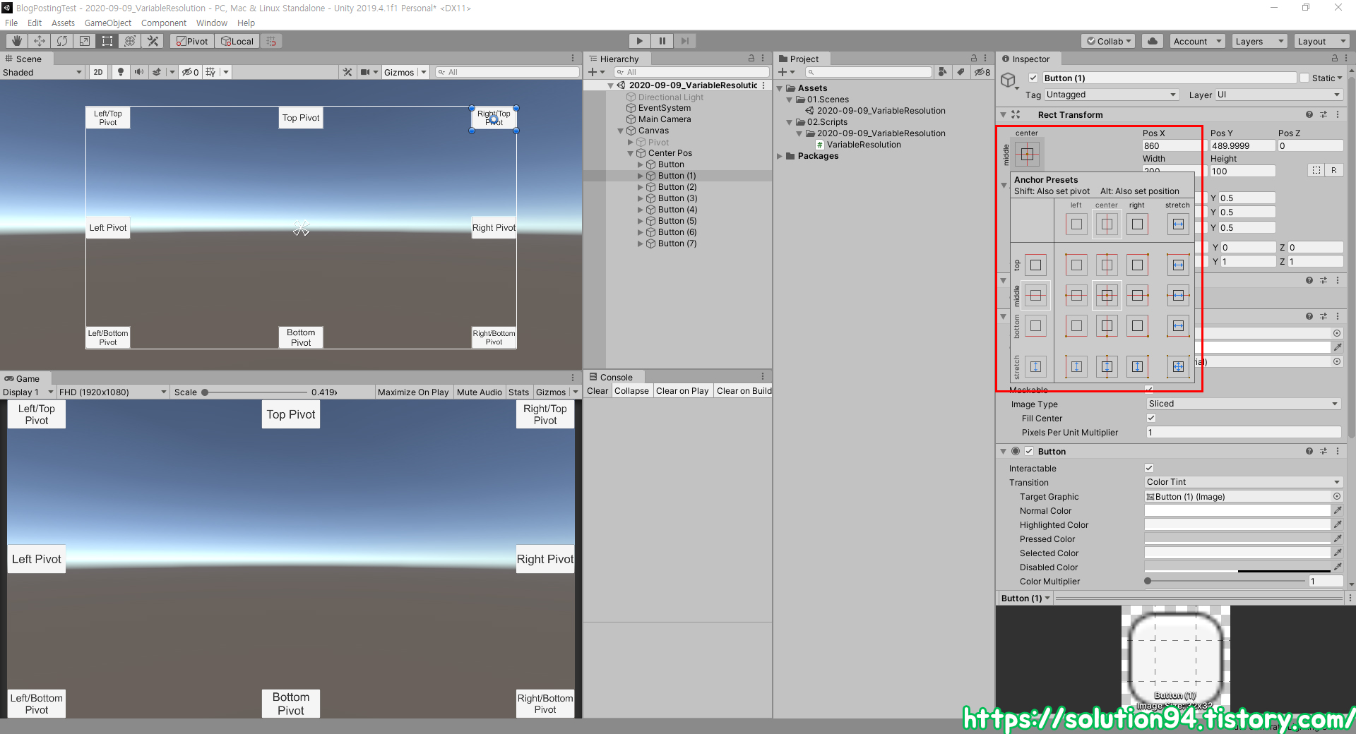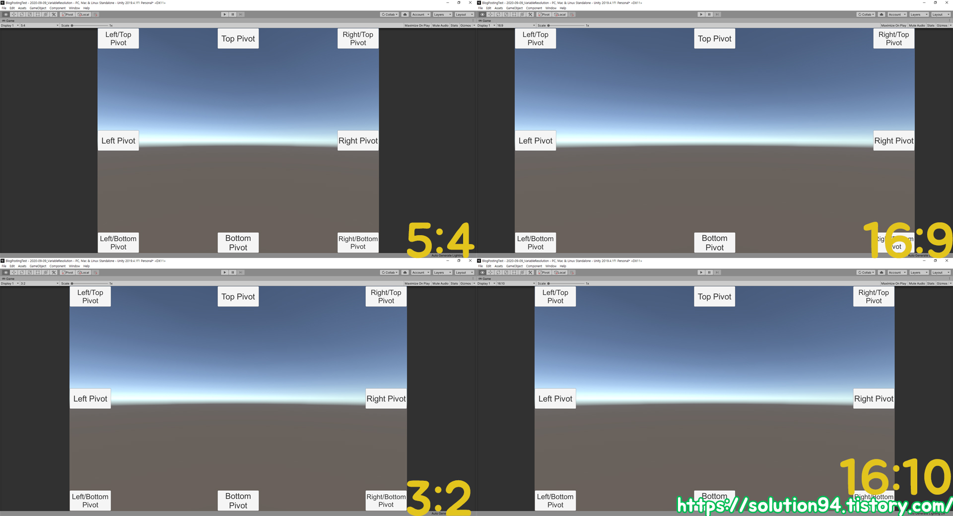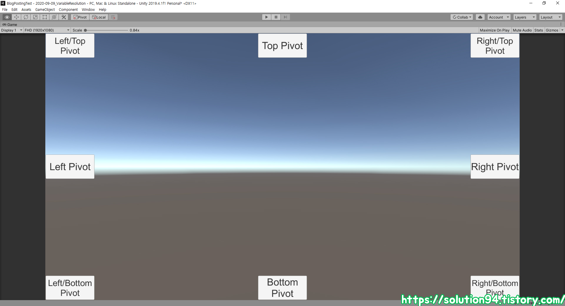 이렇게 피벗을 이용하면 실행하는 해상도에 대응해서 자동으로 배치를 시킬 수 있습니다.