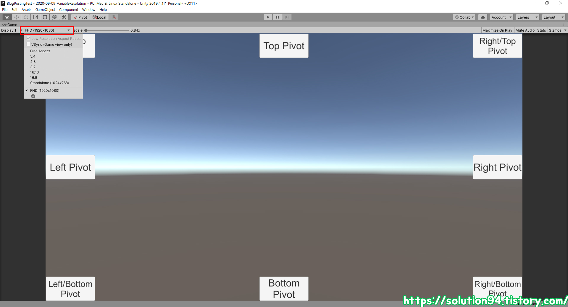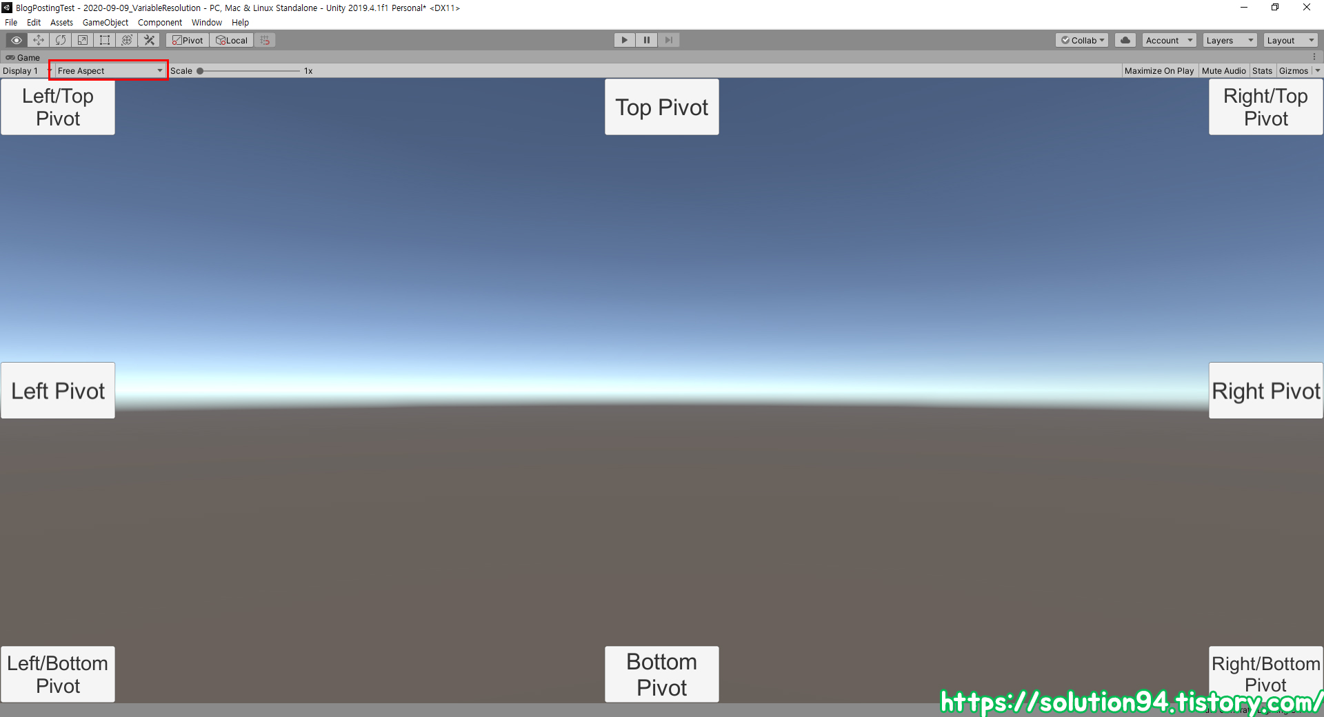 피벗 설정을 다시 해주고 게임씬을 전체화면으로 만들어보면 이전과 동일하게 레터박스가 생성되고 각 위치에 보여집니다. 겉으로 봐선 아까와 아무런 차이가 없습니다.