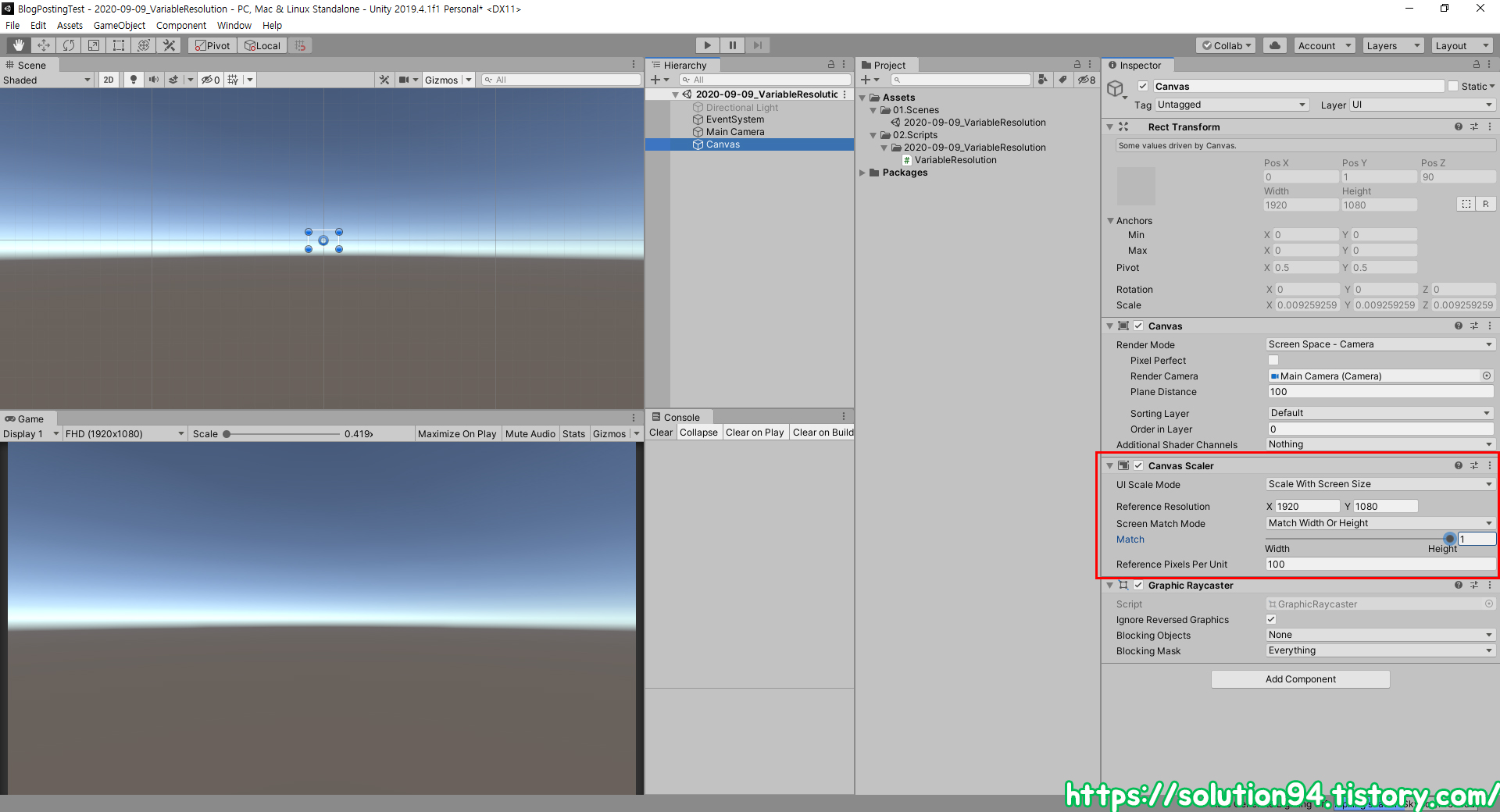 UI Scale Mode를 기준이 되는 해상도에 맞춰 재배치가 가능하도록 Scale With Screen Size로 바꿔주고 Reference Resolution에 원하는 기준 해상도를 잡아줍니다. 저는 가로 환경 FHD로 설정해주겠습니다. 마지막으로 Screen Match Mode가 Match Width Or Height로 설정되어 있는 상태에서 Match값을 1로 설정시켜줍니다. 만약 세로 환경으로 만드실 경우 0으로 설정해주시면 됩니다.