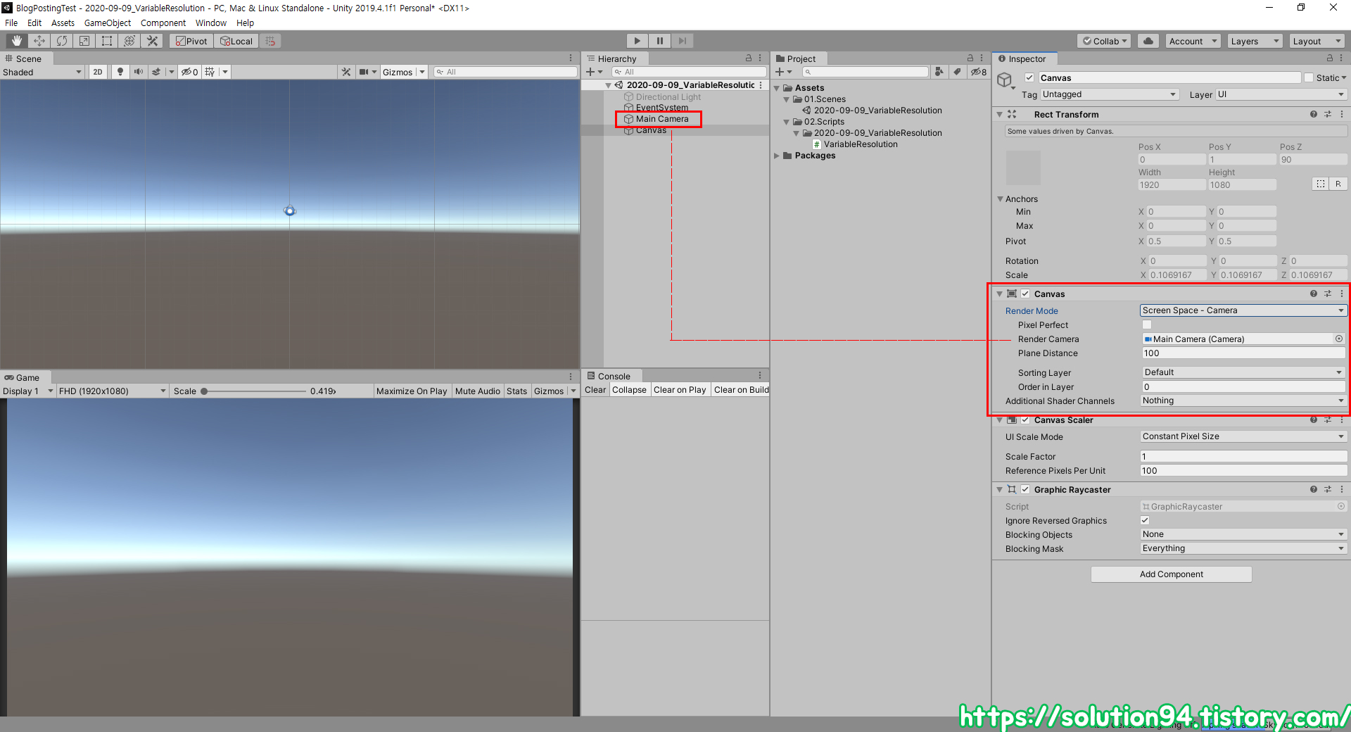 Canvas Scaler설정에 앞서 먼저 Canvas 컴포넌트의 설정을 바꿔주도록 합시다.