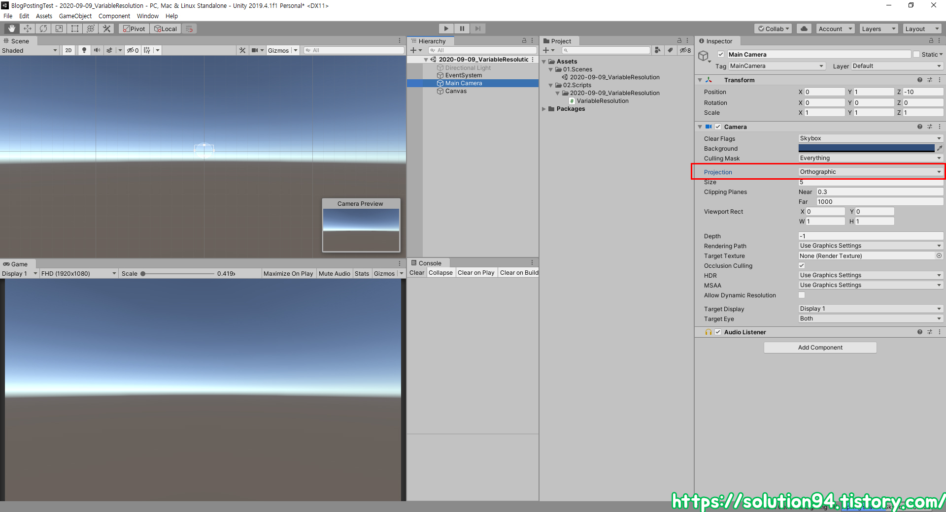 UI 요소들은 특별한 경우가 아니라면 항상 평면공간 2D에서 표현시키기 때문에 링크시킨 카메라 오브젝트에 Projection 값을 Orthographic으로 설정시켜줍니다. Size는 원하는대로 조절하셔도 상관없습니다만, 어차피 캔버스에서 기준이 되는 해상도를 잡아줄 것이기 때문에 하지않겠습니다.