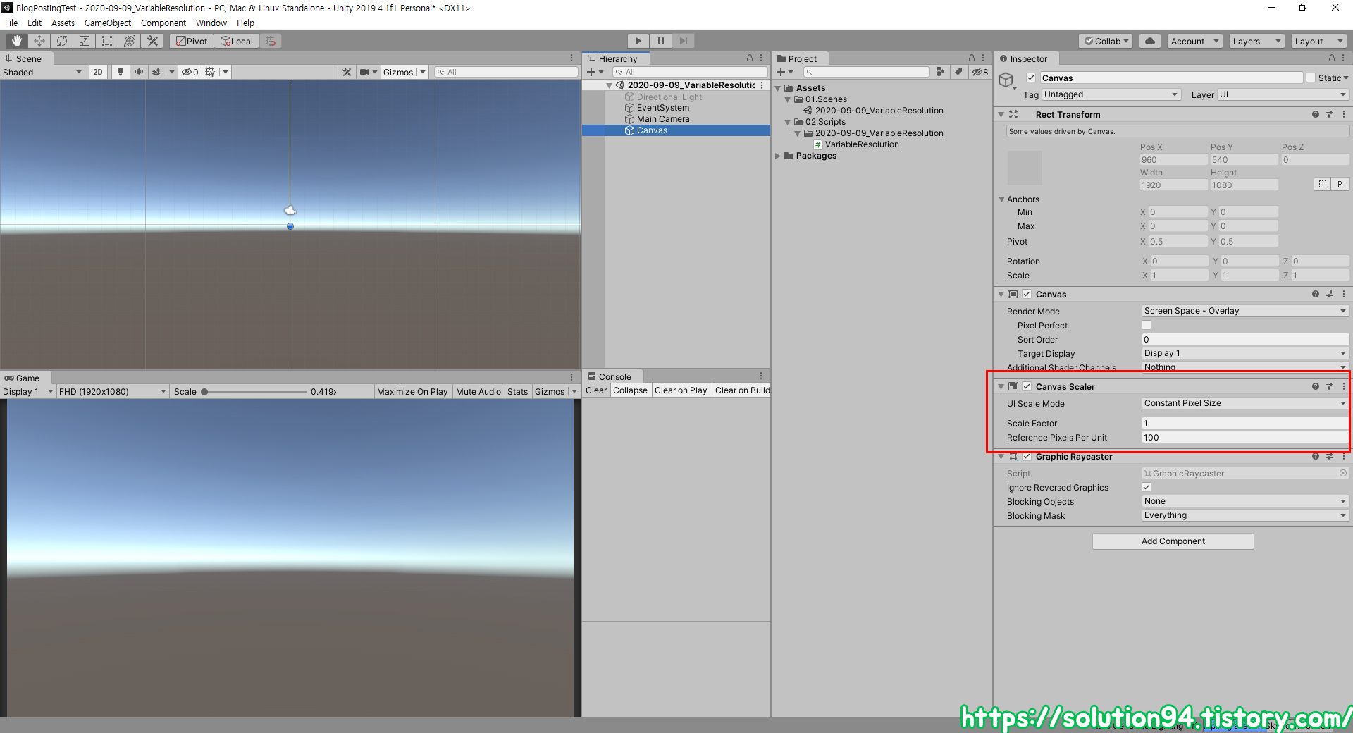 다시 캔버스로 돌아와서 처음 언급했던 Canvas Scaler 옵션을 설정해주도록 합시다.