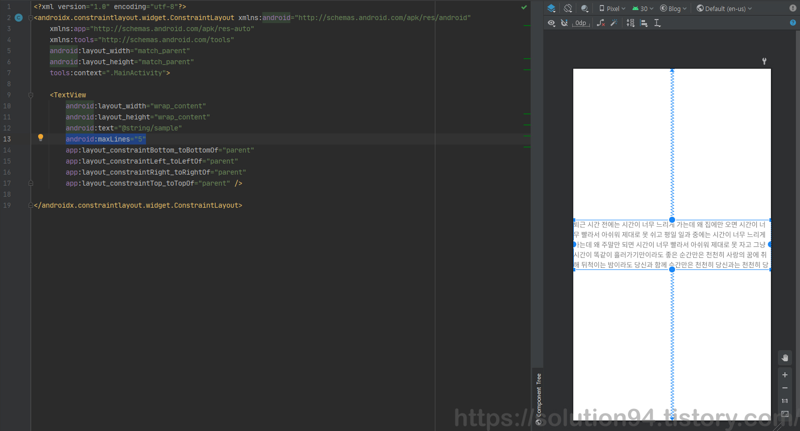 줄 수를 제한하는 방법은 아주 간단하다. TextView 속성 중에 'maxLines'를 넣어주고 원하는 줄 수 만큼을 넣어주면 된다. 다만 이렇게 내용이 뚝 잘려버리면 어색하기도 하고 내용이 더 있다는게 표현되지 않기 때문에 줄임 표시 '...'를 넣어주면 더 보기 좋지 않을까?