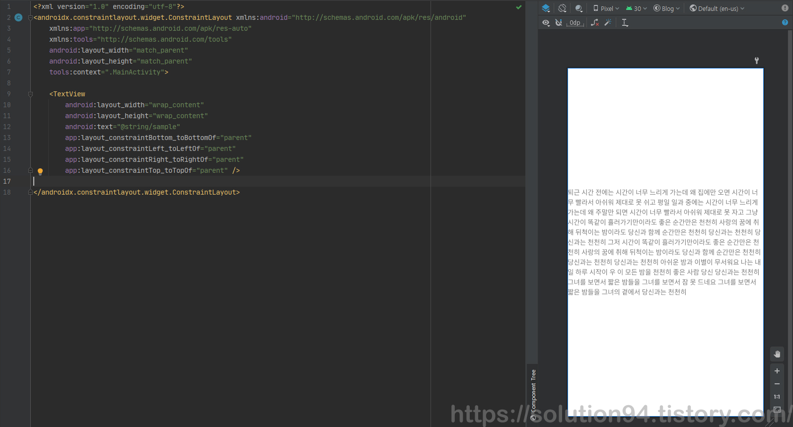 TextView에 줄 수 제한을 주지 않고 텍스트를 넣으면 모든 텍스트가 표시된다. 물론 사진에서는 layout의 가로세로 길이를 wrap content로 두어서 모든 텍스트가 보여지고 있는 상태이고, parent의 크기가 작은 곳에서 match parent였거나 지정된 임의의 크기였다면 텍스트는 가능한 만큼만 표시되고 잘렸을 것이다.