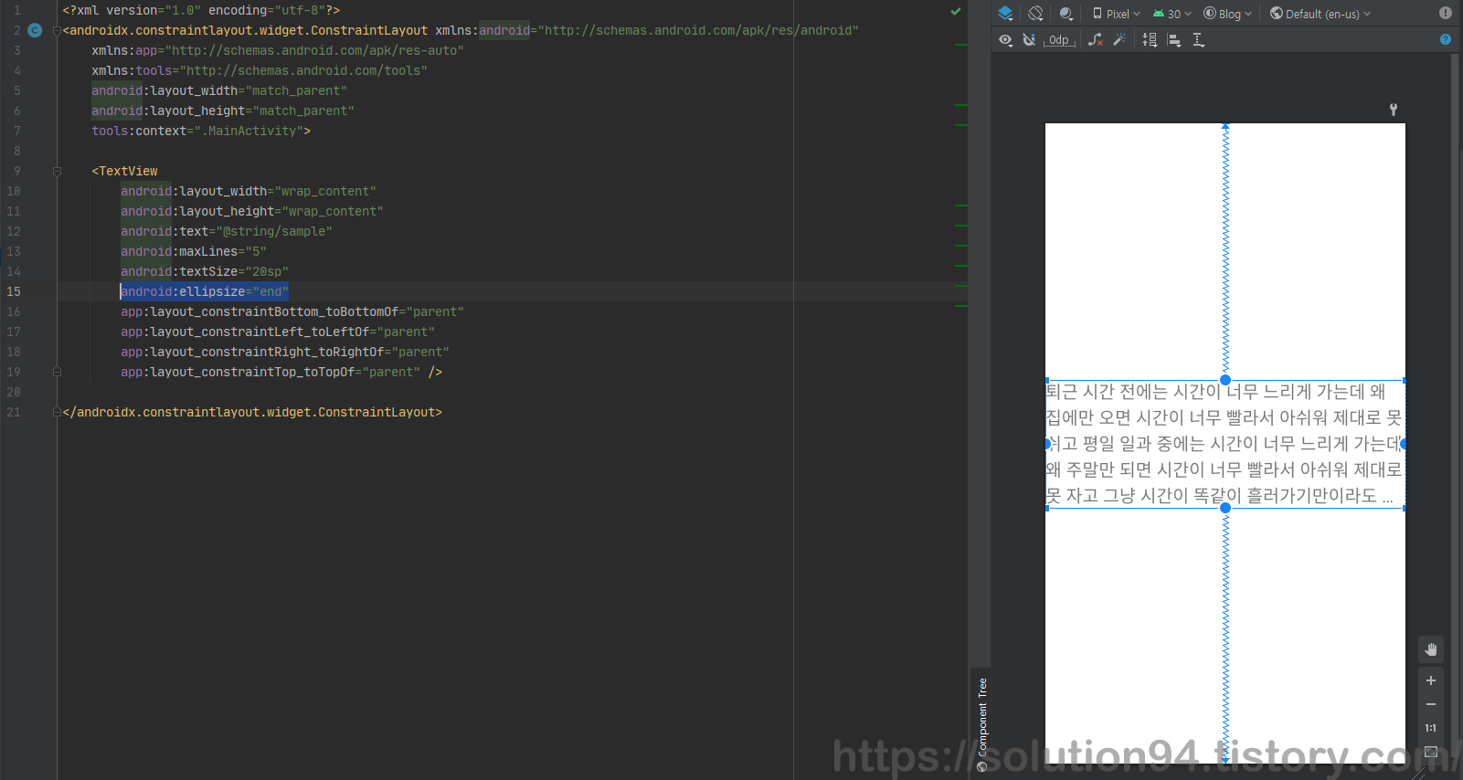 줄임 표시 또한 간단하다. TextView 속성 중 'ellipsize' 라는 속성을 사용하면 된다. 속성 값으로는 'end', 'none', marquee', 'middle', 'start' 총 5가지가 존재하는데 줄임 표시의 위치를 지정해준다고 생각하면 될 것 같다.