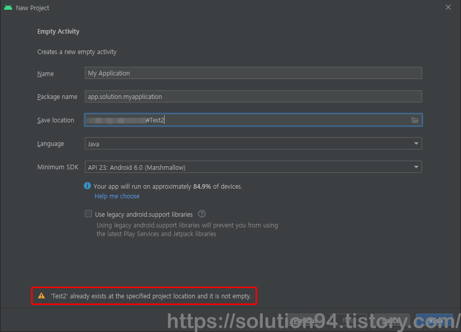 여기서 문제는 git으로 clone을 하려는 경로도 비어있어야하는데 Android Studio로 프로젝트를 생성하려는 경로도 비어있어야 한다는 것이다.