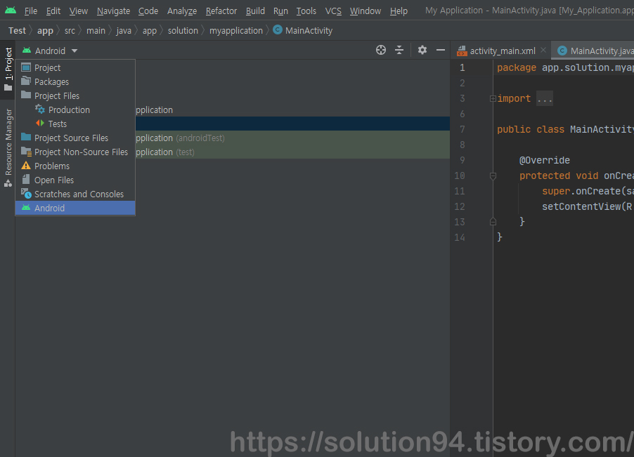 안드로이드 스튜디오(Android Studio)를 사용해서 안드로이드 프로젝트를 생성 시 기본 레이아웃 설정 기준 좌측 상단 부분에 프로젝트(Project) 탭이 존재한다. 나중에라도 다른 모드로 볼 일이 있을까 모르겠지만 아직까지는 별다른 어려운 기술을 만지거나 외부에서 파일을 넣는 등의 작업은 한적이 없는 탓인지 프로젝트 탭에서 보기 모드를 'Android'로 두고 작업하고 있다.