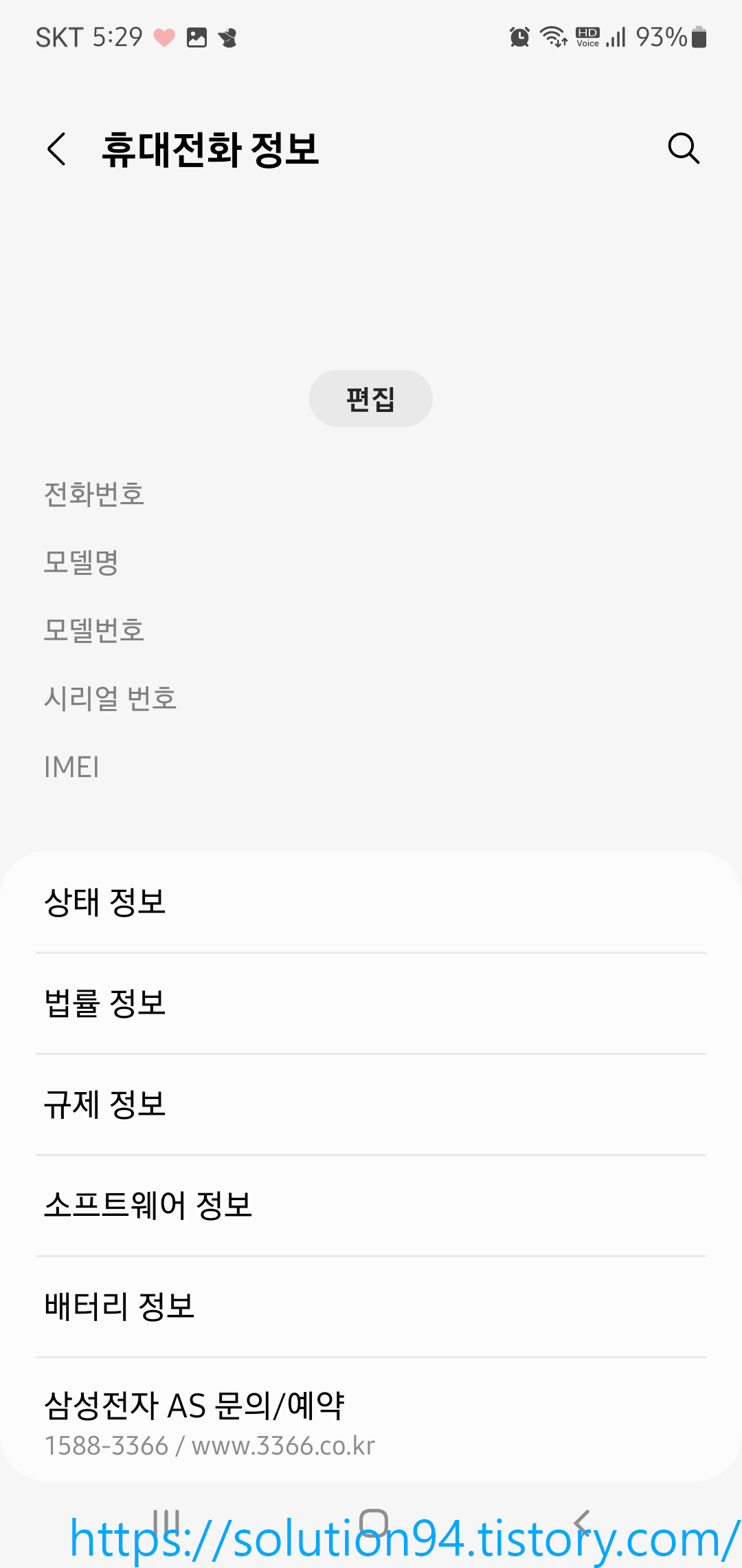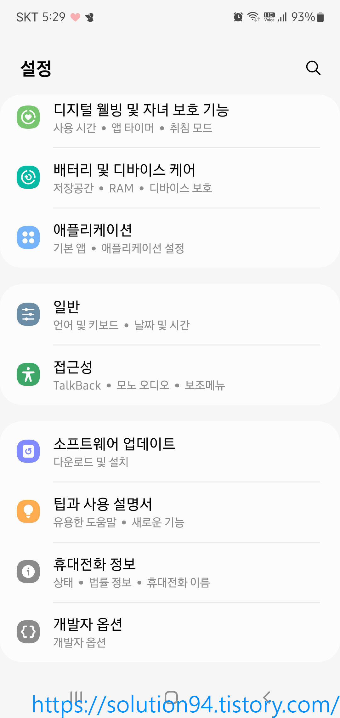 설정에 들어가서 하단에 '휴대전화 정보'에 들어간다. (사진에는 이미 내가 개발자 모드를 켜 두어서 개발자 옵션이 보이는 상태이다. 일반적인 기기에서는 보이지 않는다.)