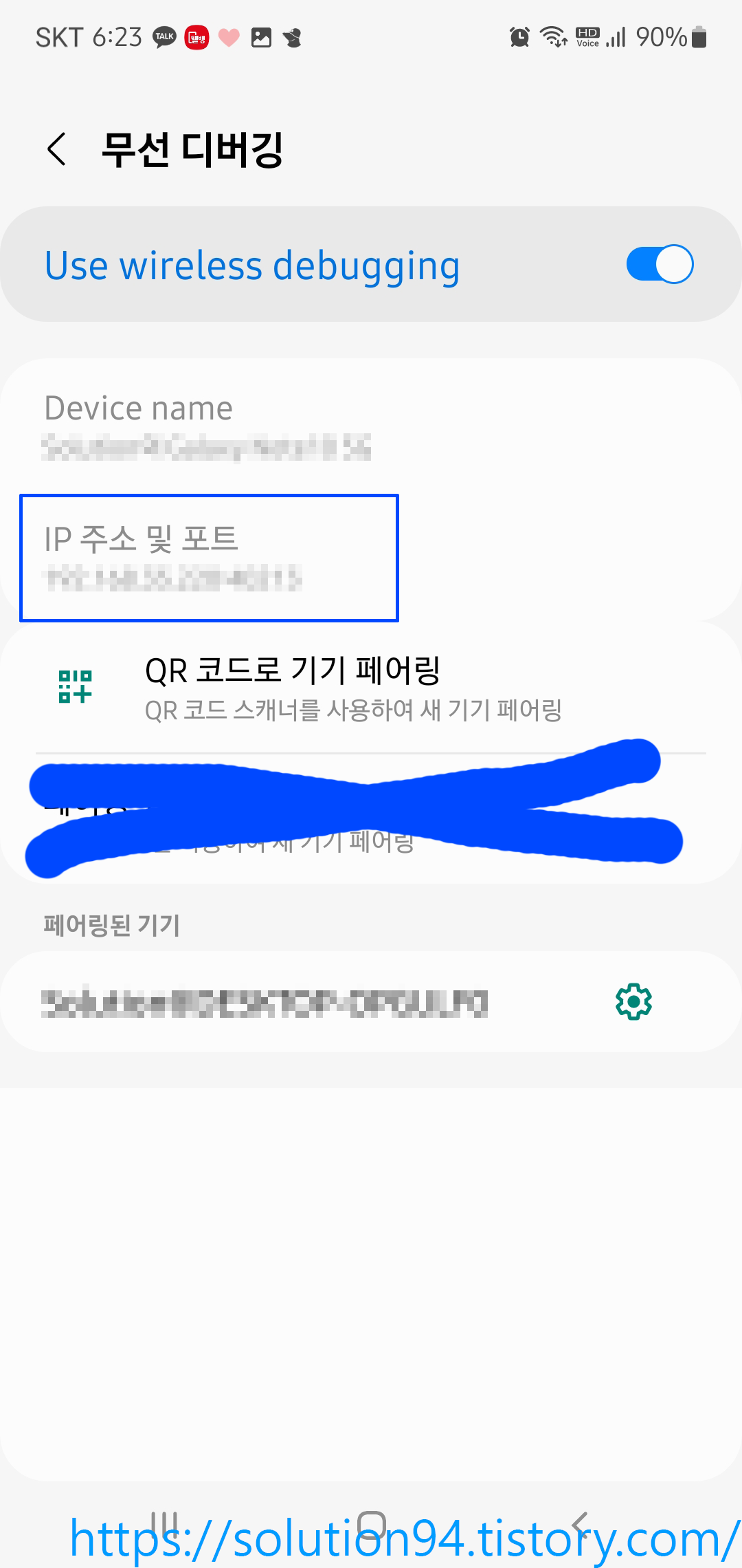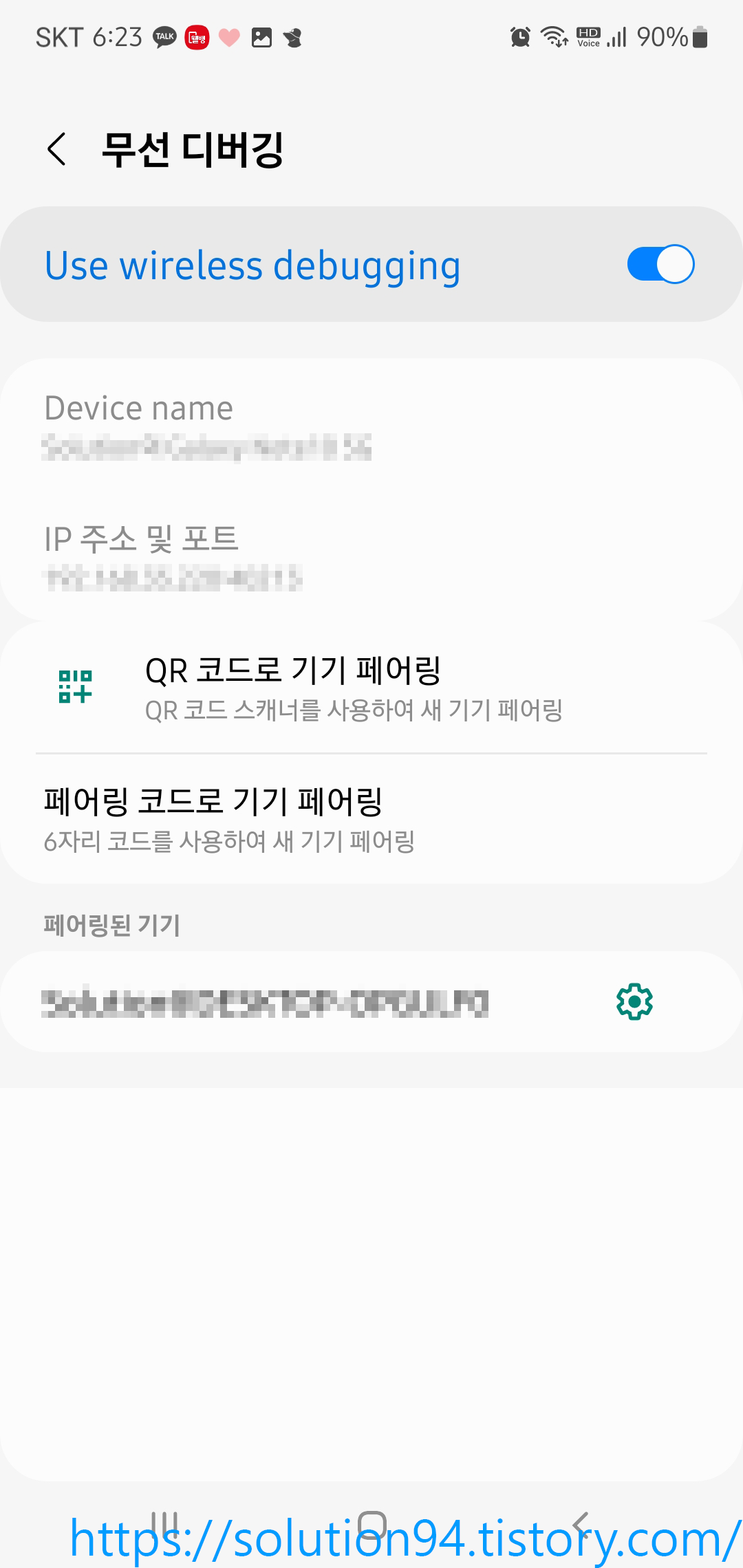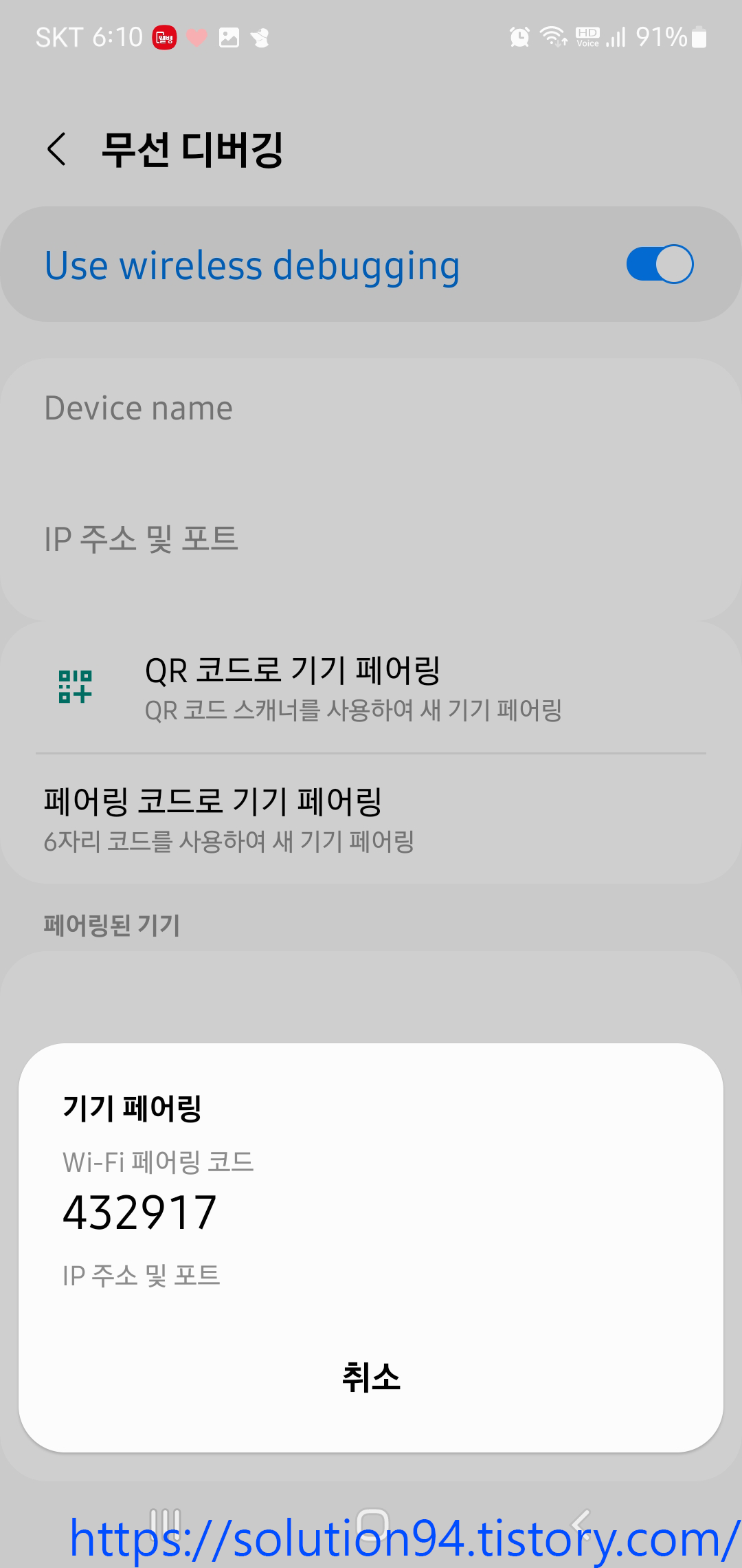 이제 연결하려는 모바일 기기의 IP와 Port, 페어링 코드가 필요하기 때문에 기기의 개발자 옵션에서 '페어링 코드로 기기 페어링'을 눌러서 값들을 확인한다.