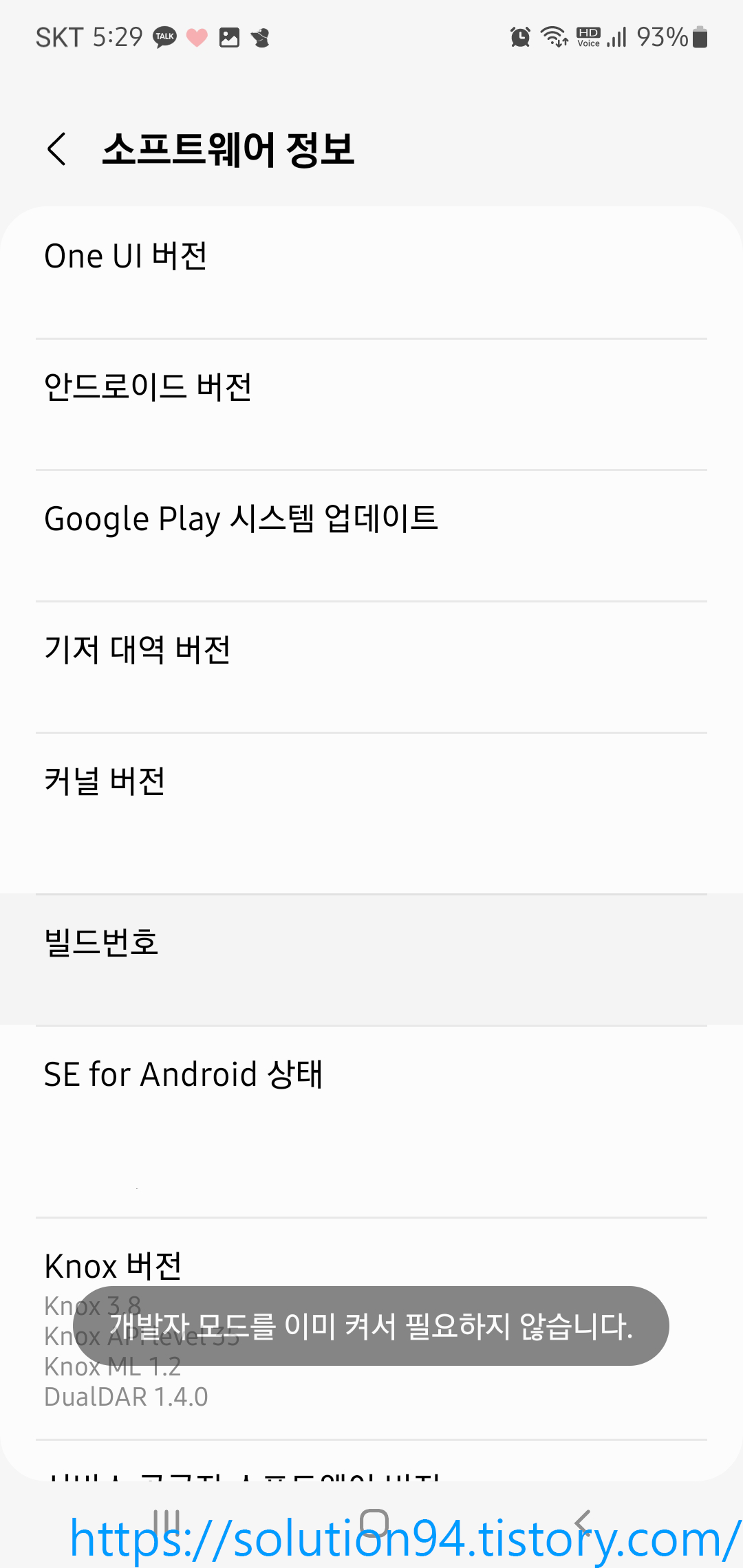 여기서 '빌드번호'라는 곳을 터치하다 보면 토스트 메시지로 개발자 모드에 들어간다는 안내가 나오다가, 비밀번호를 입력하면 개발자 모드가 활성화된다.