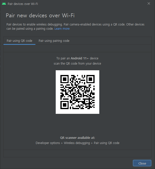 드디어 '무선 디버깅' 메뉴에 진입했다. 여기서 'QR 코드로 기기 페어링'을 누르면 카메라가 켜지는데 안드로이드 스튜디오에 표시되고 있는 QR코드를 인식시키면 나머지는 자동으로 진행된다.