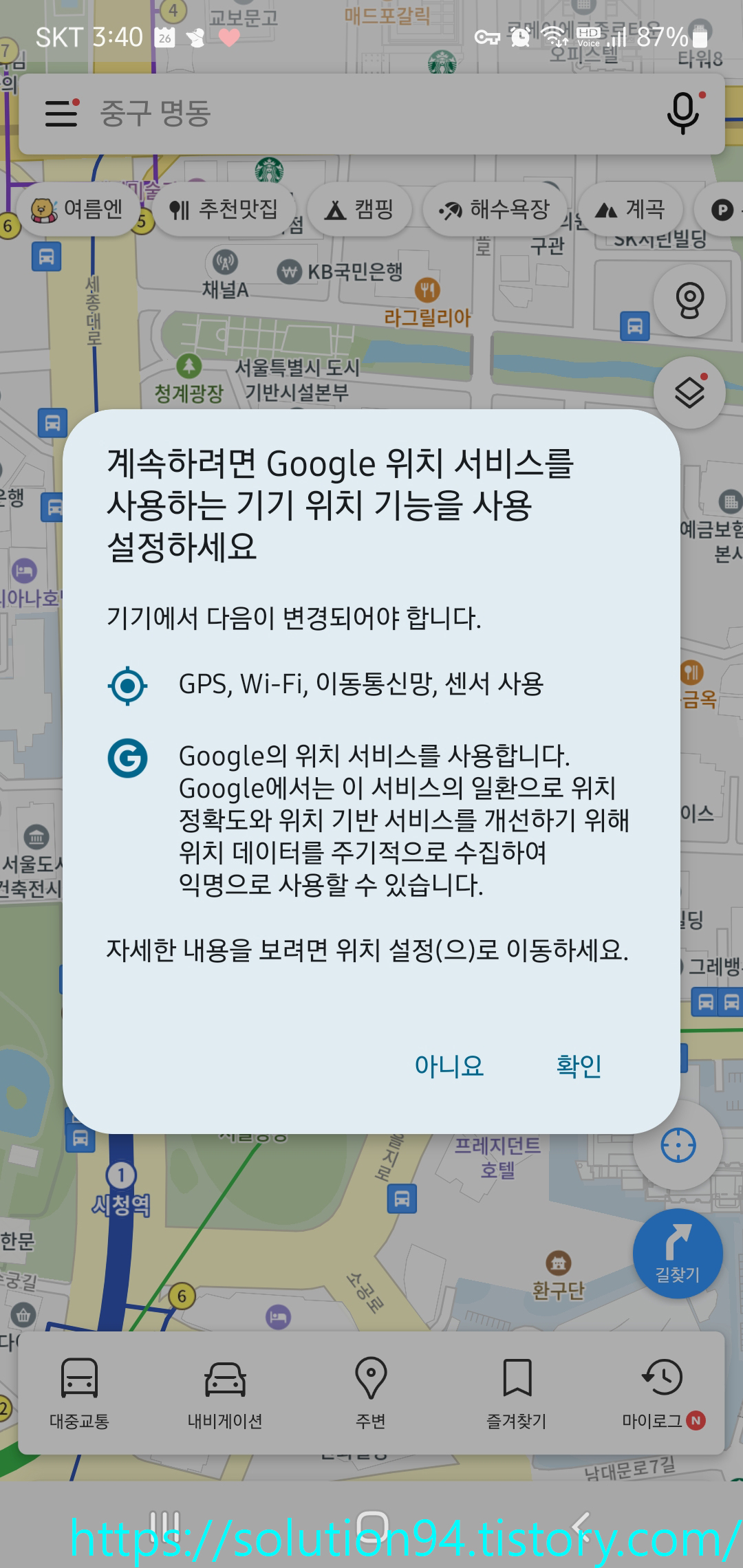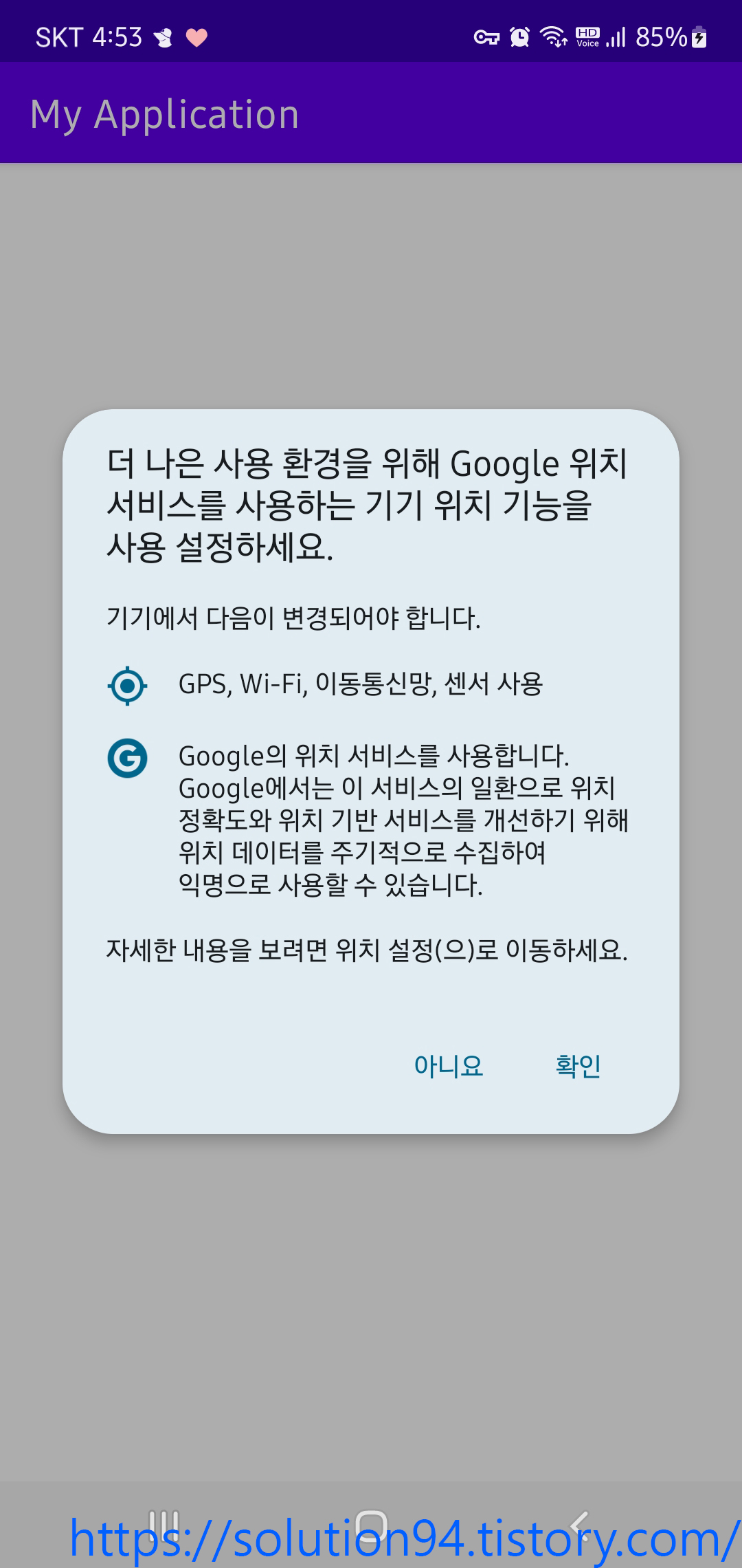 거의 대부분의 사이트에서는 Intent로 단순히 위치 서비스(GPS) 옵션 화면으로 보내주는 방법을 소개하고 있었다. 물론 이렇게 해도 기능에는 아무 문제가 없지만 원하는 방식도 아니었고 개인적으로 이 방법은 사용자 측면에서 번거로웠다.