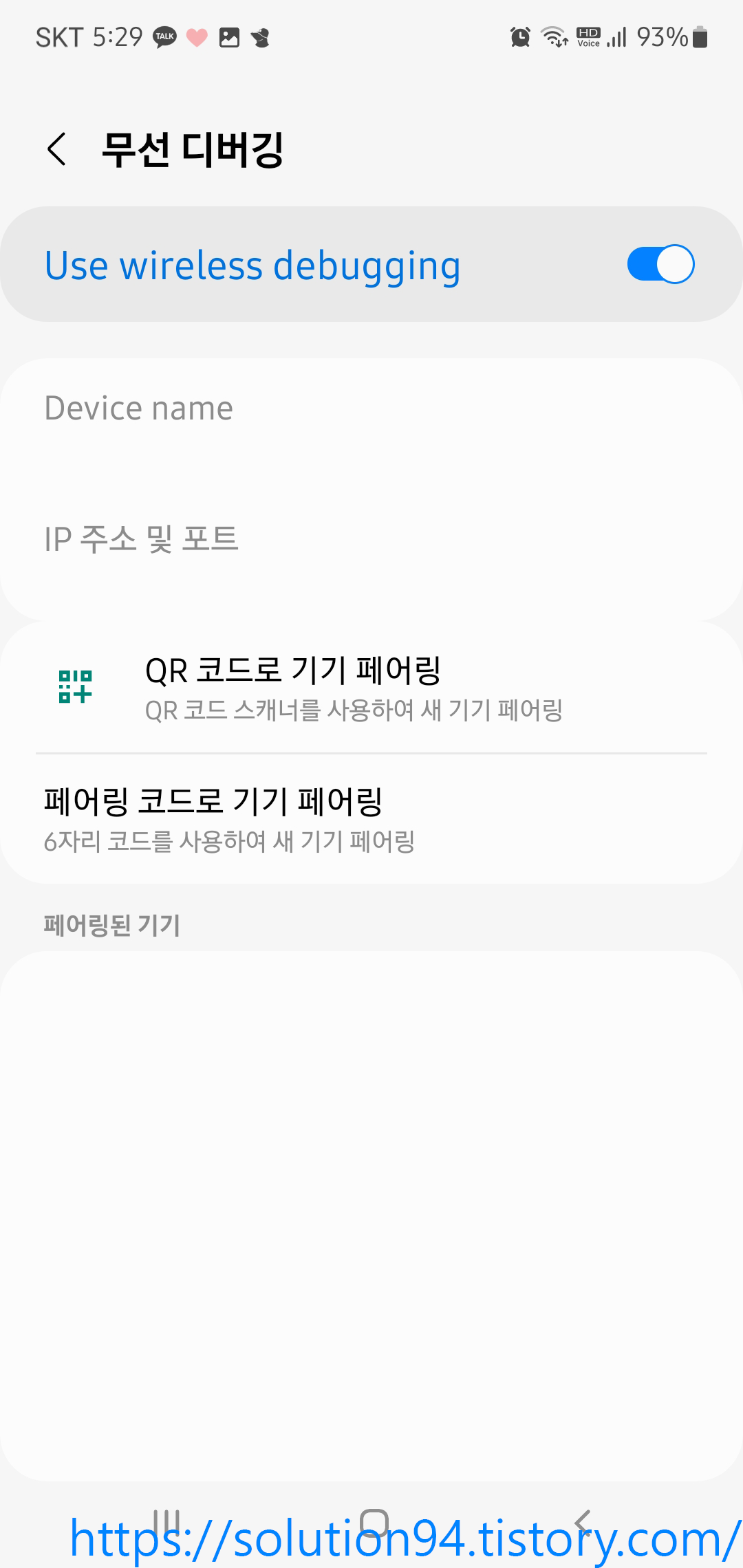 이제 연결하려는 모바일 기기의 IP와 Port, 페어링 코드가 필요하기 때문에 기기의 개발자 옵션에서 '페어링 코드로 기기 페어링'을 눌러서 값들을 확인한다.